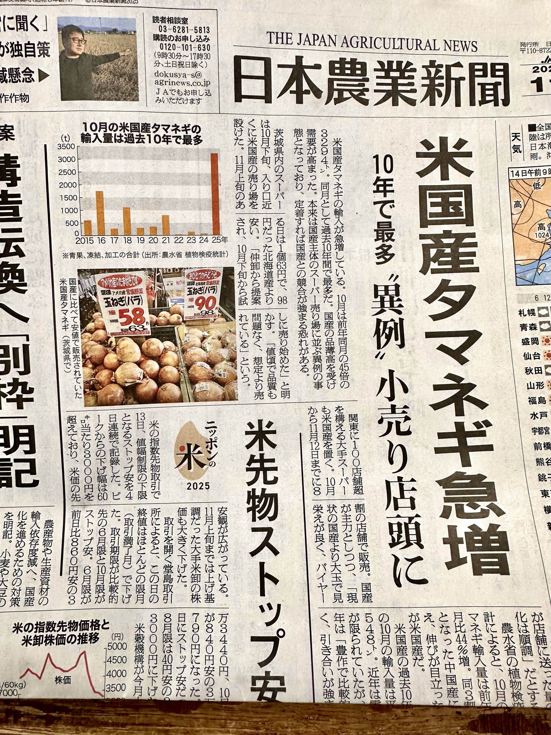 先日の農業新聞に掲載されてましたが、たまねぎの収穫が壊滅的なダメージを受けた結果、輸入品が増え価格も高騰しているそうです。これはじゃがいもも同様で、しばらくは高級食材になってしまいますね。来年の作付け、考えないとですね。。