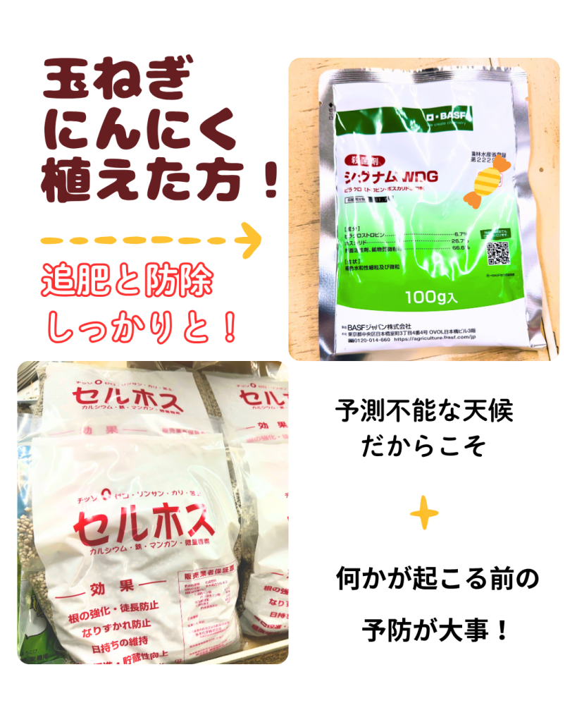 追肥にはセルホス(たまねぎ11月1回、3月1回、にんにく3月1回、4月1回、上からパラパラと撒いてください)、消毒にはシグナム(たまねぎ植えた後11月、雪解け3月、収穫前5月)おススメです