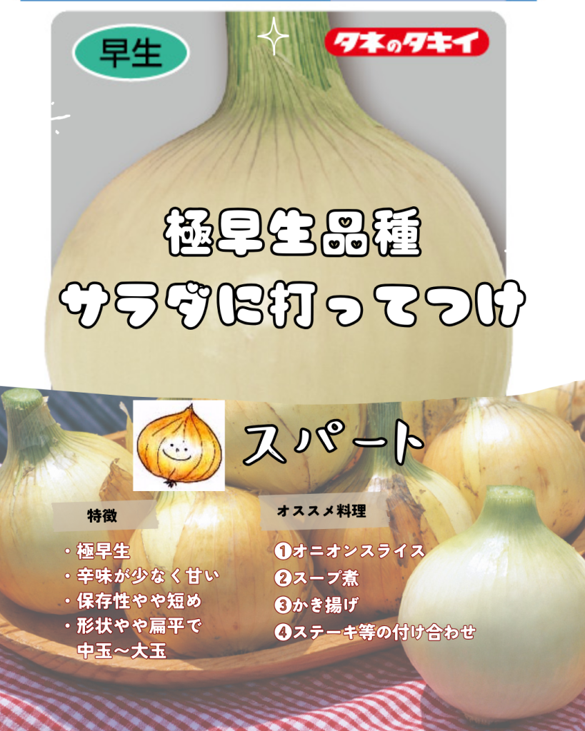 ・スパートは極早生の辛味が少ない品種で、サラダやオニオンスライスにはもってこいの品種です
