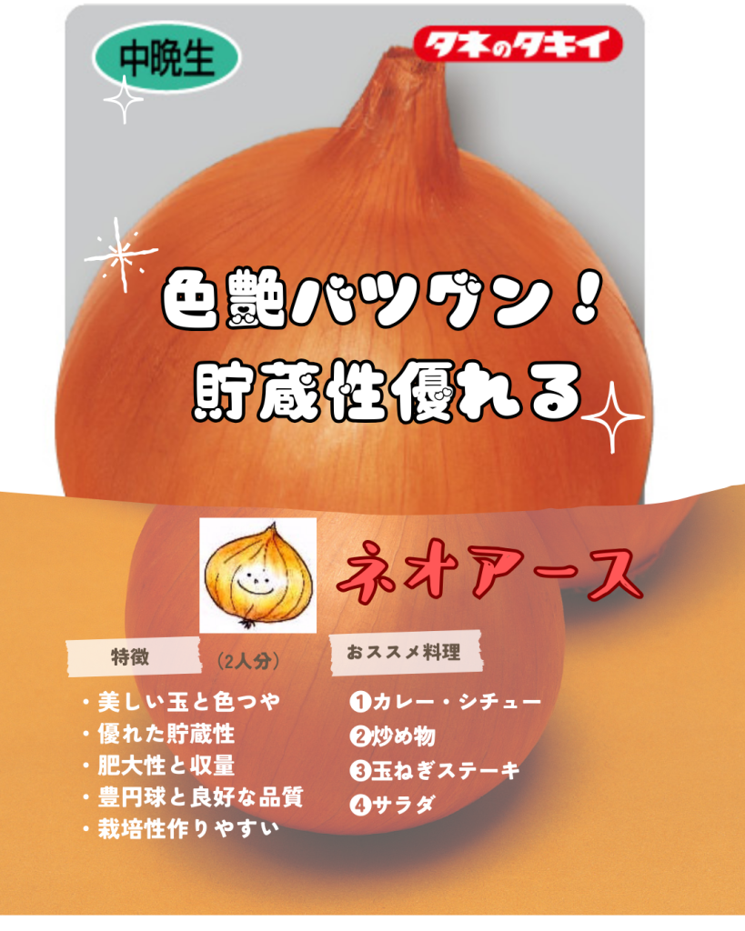 ・ネオアースは色艶バツグンで貯蔵性にも優れている玉ねぎのスタンダードと言える品種です。あらゆる料理に適した万能選手なので、食卓には欠かせない一品ですよね