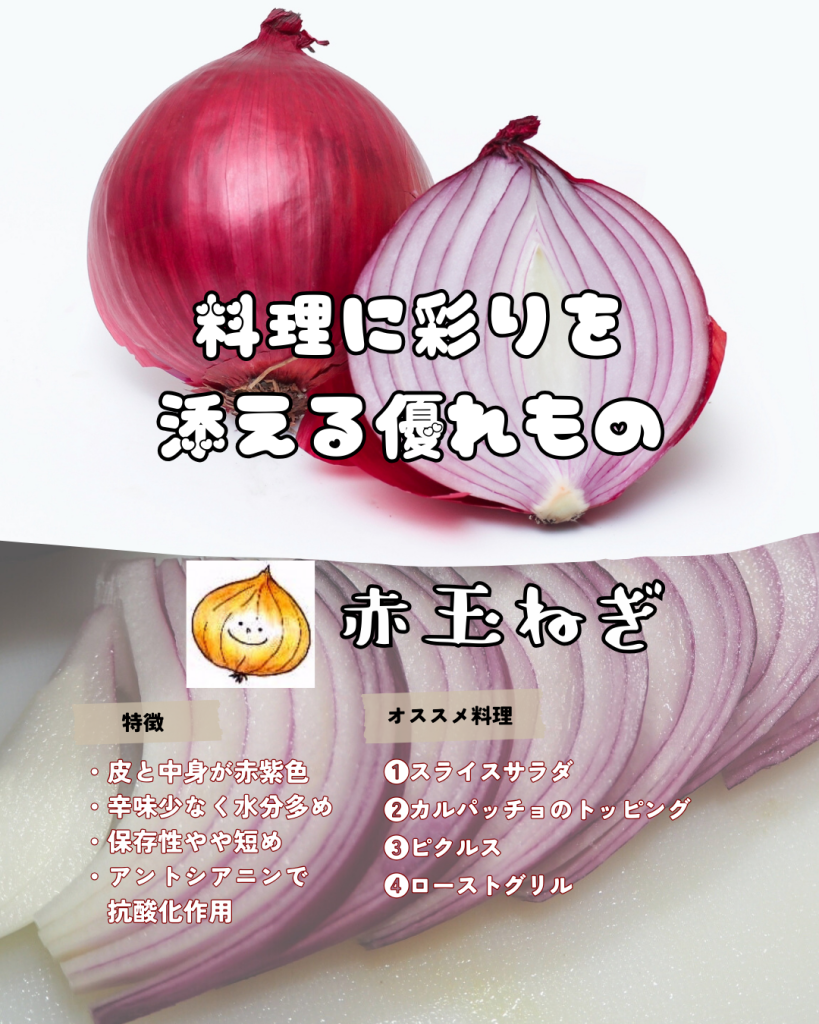 一般的な黄玉ねぎに比べて刺激が弱く、生食に向いている。 - 保存性はやや短め