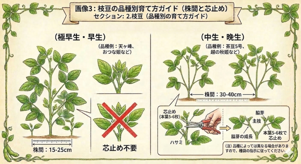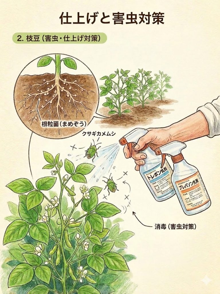 ★収穫量アップの秘策: > 中生以降の品種は、本葉5〜6枚で先端を切る(芯止め)と、脇芽が出て実がたくさんつきます。また、種まき時に**「まめぞう(根粒菌)」**をまぶすと根張りが格段に良くなります(必ずその日のうちに種まき完了してください!)セルホス使用で甘みが強くなりますよ